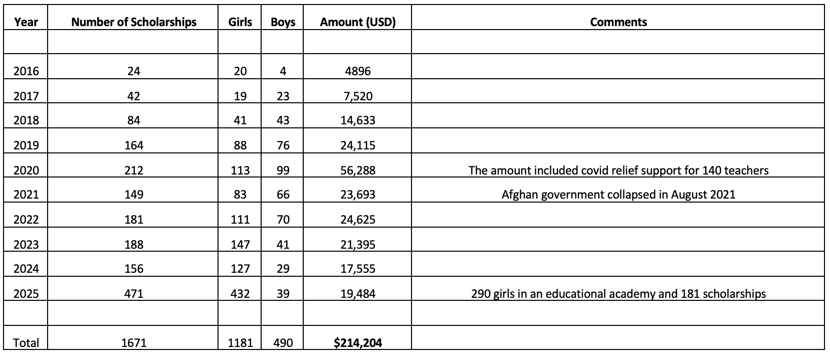 We established our scholarship program in late 2015. From 2016 to date, we have made education accessible to 1,671 at-risk youth (see table below), mostly girls, in elementary to high schools, in the marginalized and persecuted Hazara communities in Afghanistan. 1,181 girls and 490 boys have benefitted from our scholarship program. Over the years, many of our students have graduated and have moved on to obtain admissions in major colleges and universities in the United States, United Kingdom, Canada, Australia, India and Bangladesh.